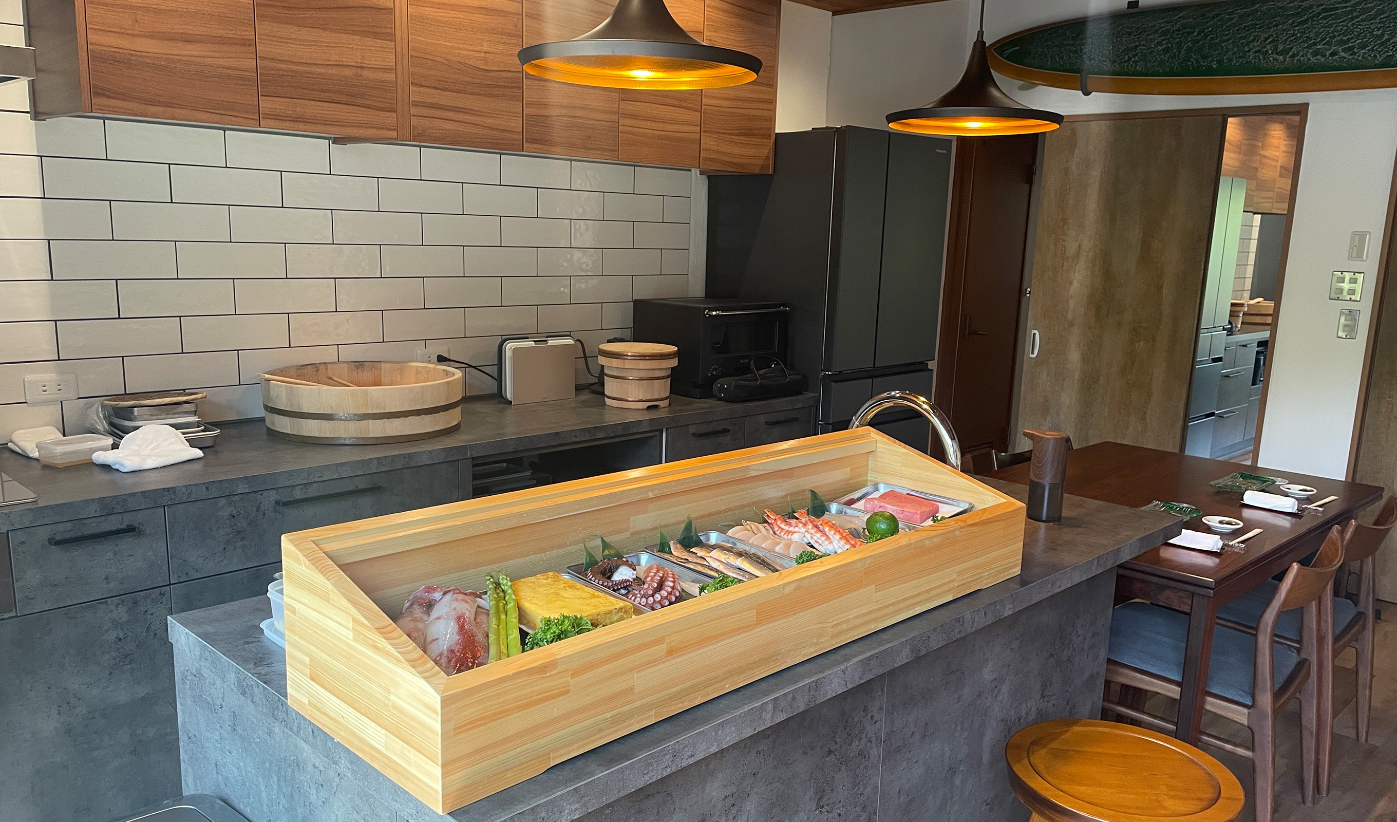 ダイニングには使いやすいカウンターキッチン、暖炉、囲炉裏、薪かまどを備えており、様々な調理が可能です。