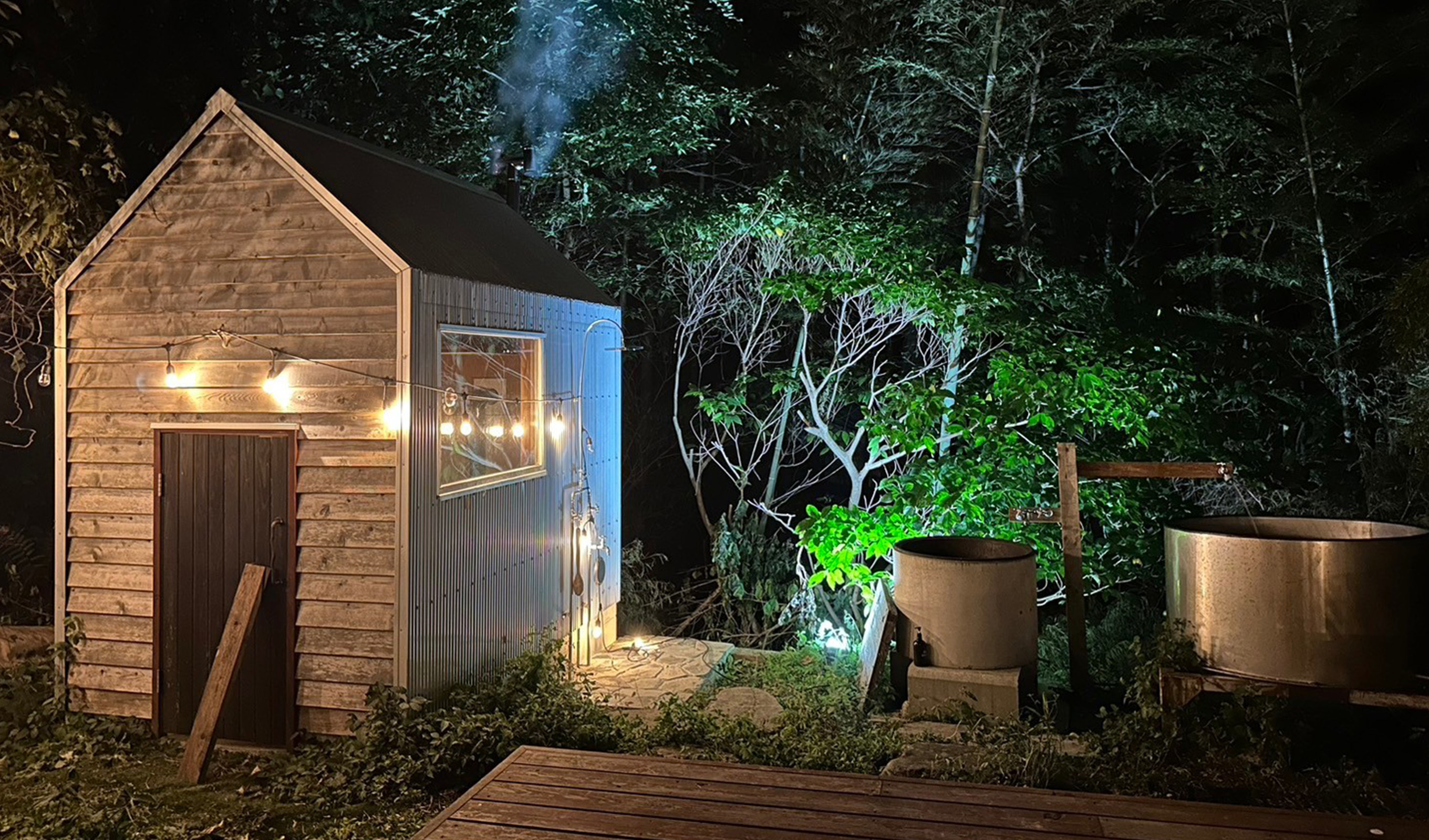 星空を眺めながら入れる水風呂と露天風呂を備えております。天然水がお肌にうるおいとハリを与え、美容にもおすすめです。入浴後はウッドデッキのソファで森の風を感じながら、ゆったりとおくつろぎいただけます。